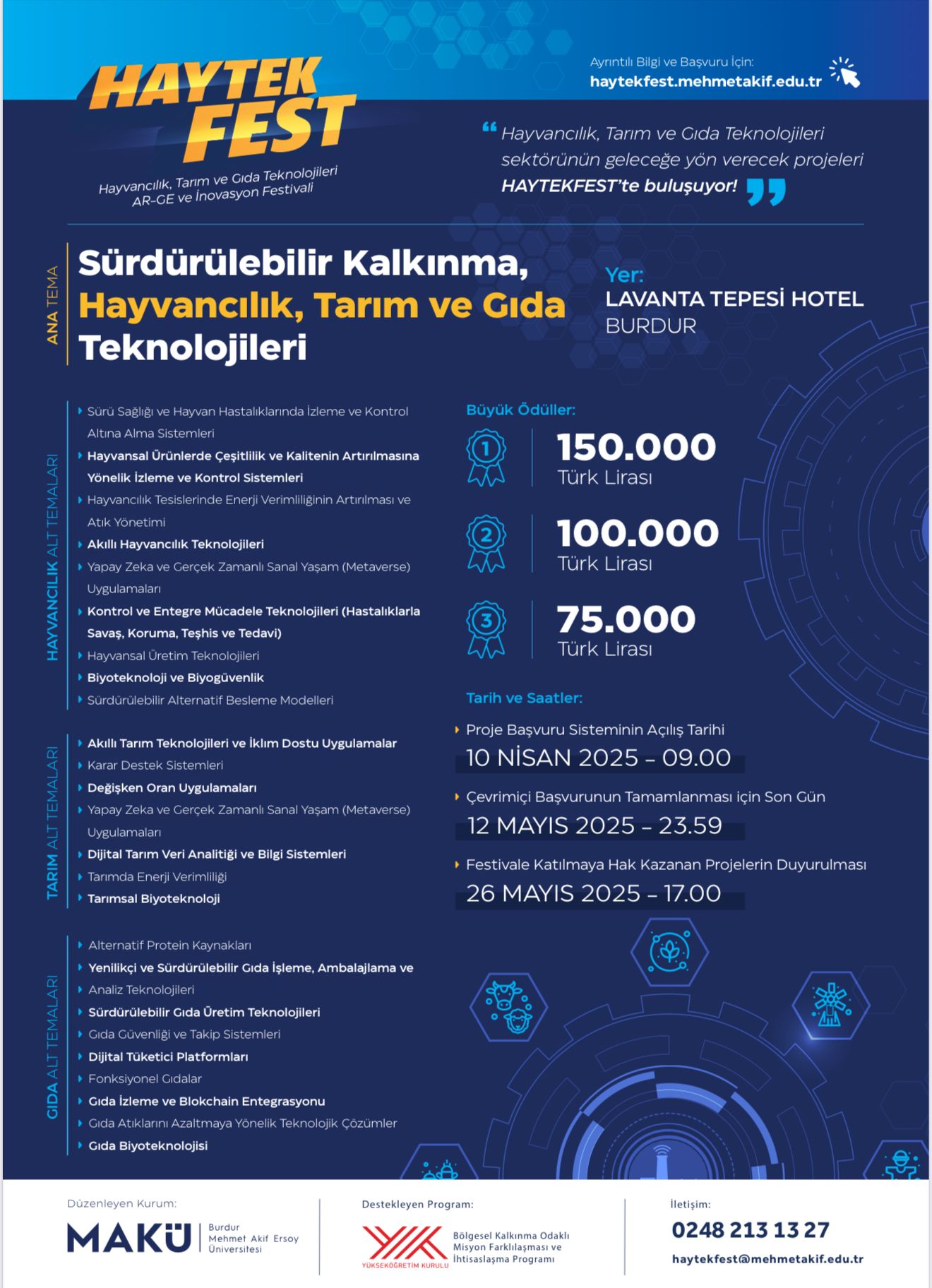 Projeler için son başvuru tarihi 12 Mayıs 2025 saat 23.59 olarak belirlendi. Başvurular, HAYTEKFEST’in resmi internet sitesi https://haytekfest.mehmetakif.edu.tr üzerinden yapılabiliyor.