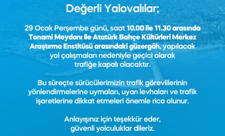 “Değerli Yalovalılar; 29 Ocak Perşembe günü, saat 10.00 ile 11.30 arasında Tonami Meydanı ile Atatürk Bahçe Kültürleri Merkez Araştırma Enstitüsü arasındaki güzergâh, yapılacak yol çalışmaları nedeniyle geçici olarak trafiğe kapalı olacaktır. Bu süreçte sürücülerimizin trafik görevlilerinin yönlendirmelerine uymaları, uyarı levhaları ve trafik işaretlerine dikkat etmeleri önemle rica olunur. Anlayışınız için teşekkür eder, güvenli yolculuklar dileriz.”